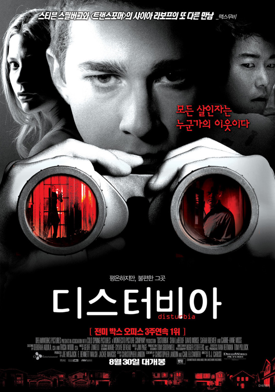 "디스터비아"는 가택연금 중인 10대 소년 케일 브레히트(샤이아 라보프)가 이웃인 터너 씨(데이비드 모스)가 연쇄 살인범이라고 확신하게 되는 이야기를 따릅니다. 영화의 줄거리는 알프레드 히치콕의 고전 "이창"에서 영감을 얻었지만, 여기에 독특하고 스릴 넘치는 현대적 요소를 더했습니다.