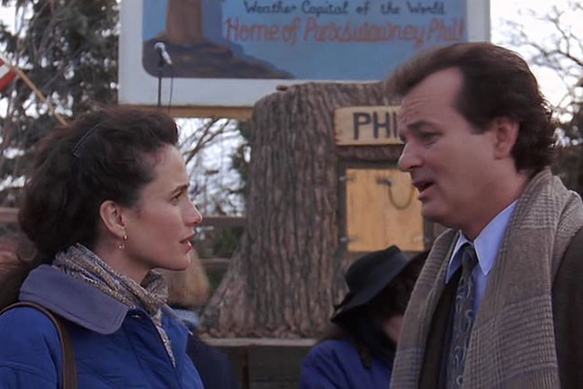 **영화 Groundhog Day (1993)**는 필 콜린스(빌 머리 분)라는 텔레비전 기상 캐스터가 주인공인 코미디 영화입니다. 필은 매년 2월 2일, 펜실베니아 주의 작은 마을에서 열리는 그라운드호그 데이 행사를 취재하러 가게 됩니다. 그런데 그가 현지에서 깨어나 보니, 매일 아침 똑같은 2월 2일이 반복되고 있다는 사실을 깨닫게 됩니다.